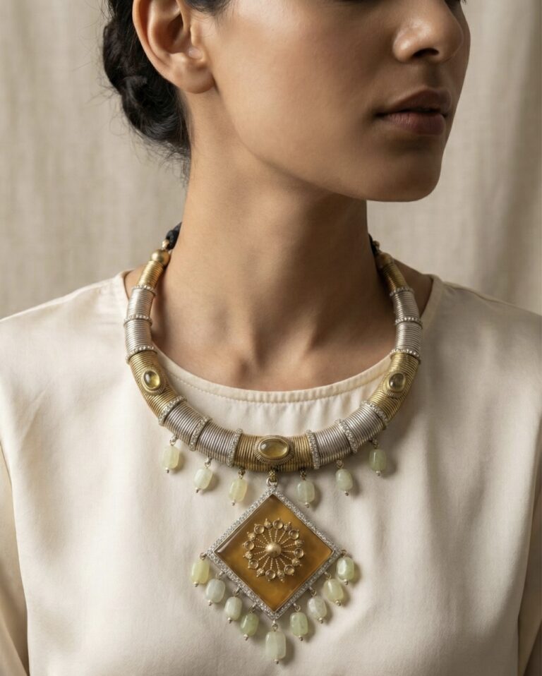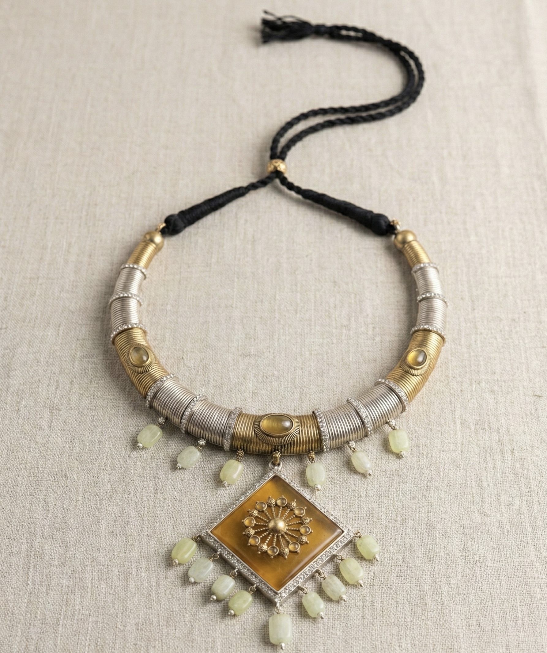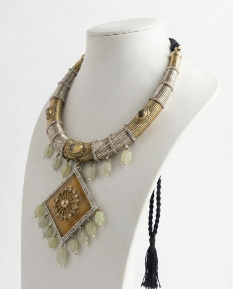 Crafted in gold-plated brass with anti-tarnish finish, this handcrafted necklace features a bold amber-toned centerpiece and semi-precious green stone drops for rustic luxury styling.