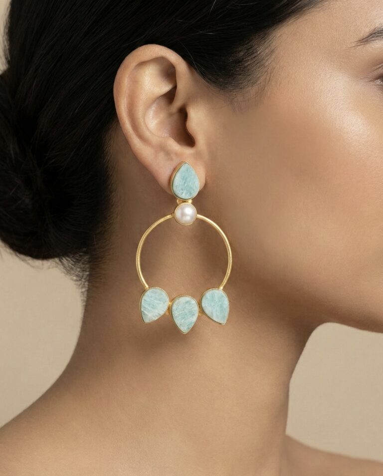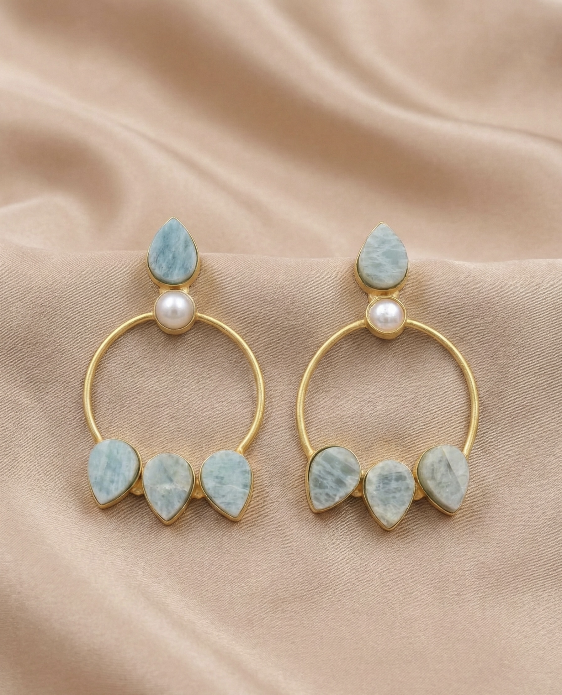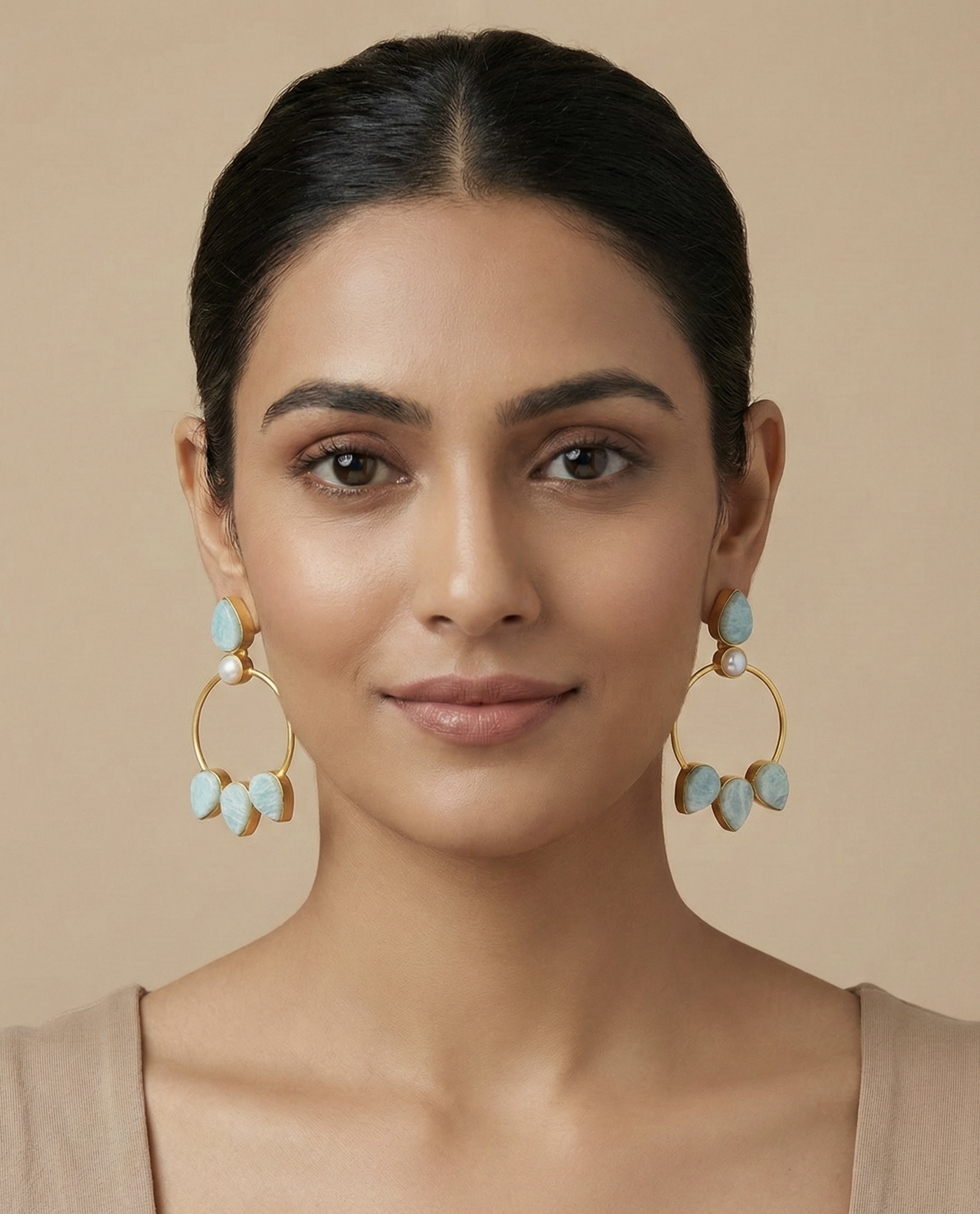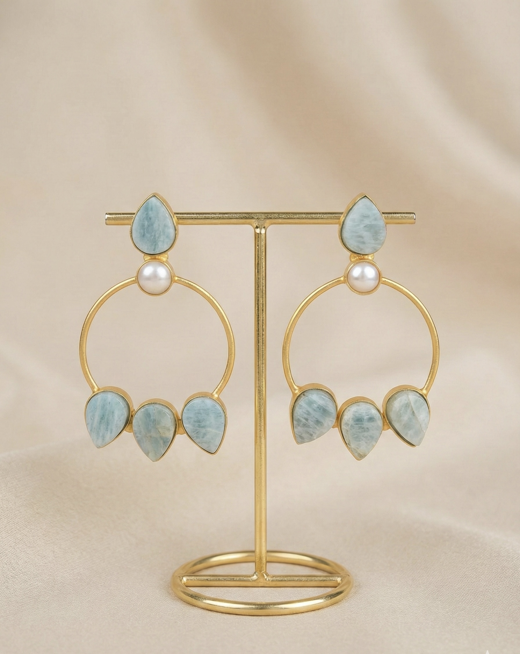 Gold-plated brass hoop earrings featuring semi-precious aqua stones and pearl accents. Finished with anti-tarnish coating, perfect for festive, resort, and statement styling.