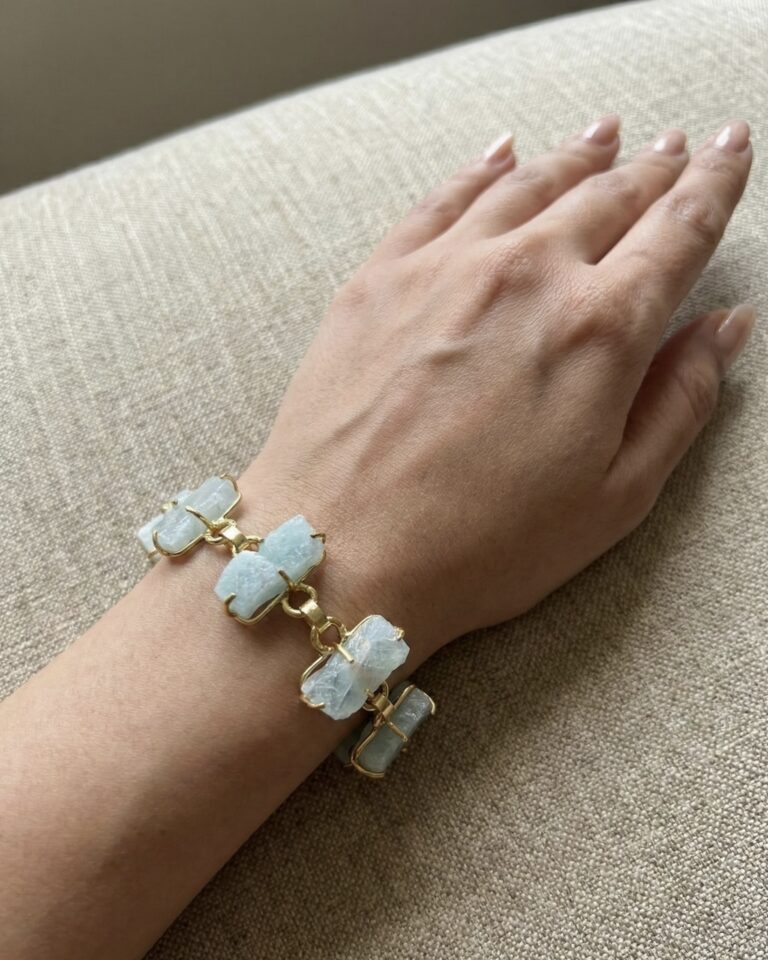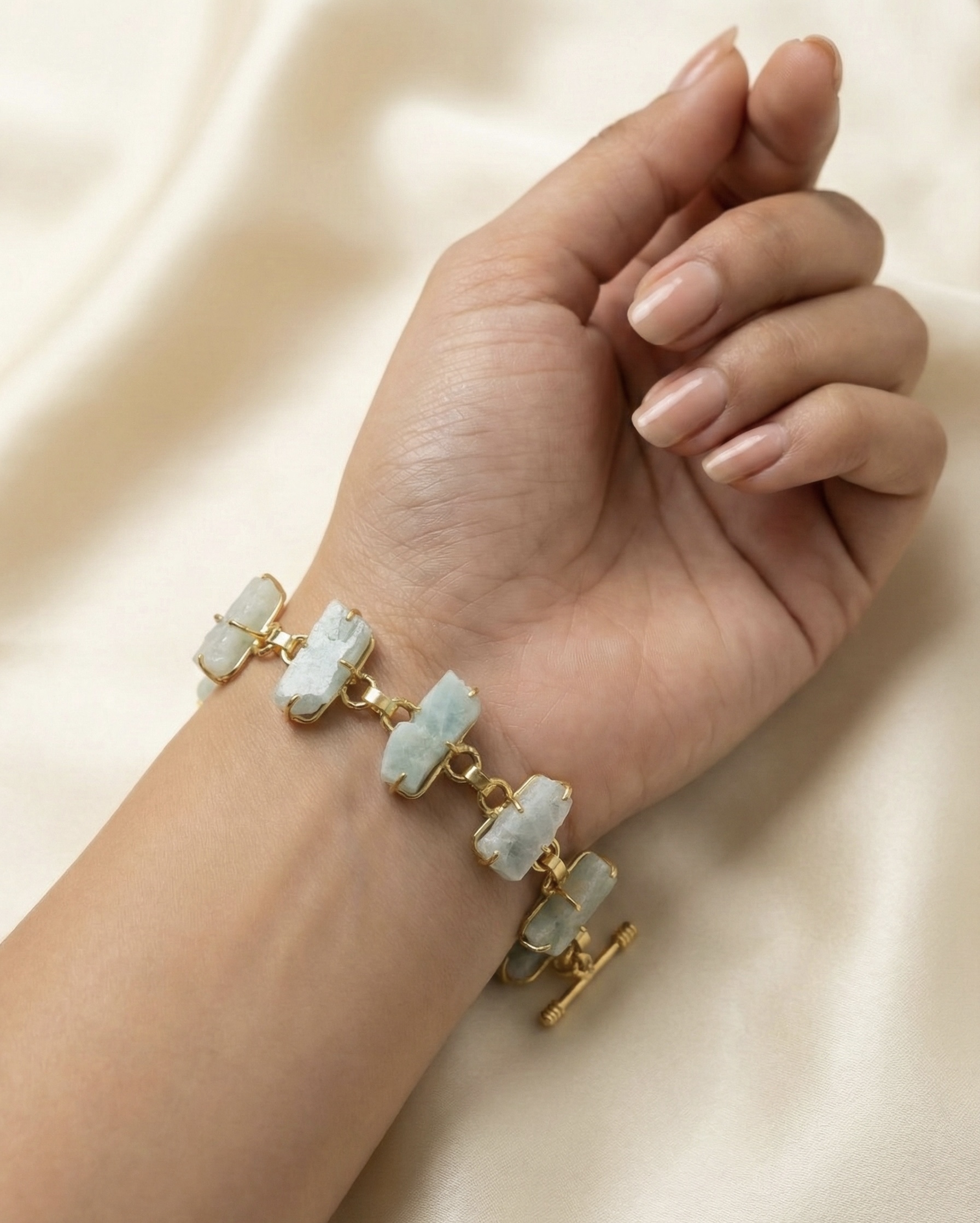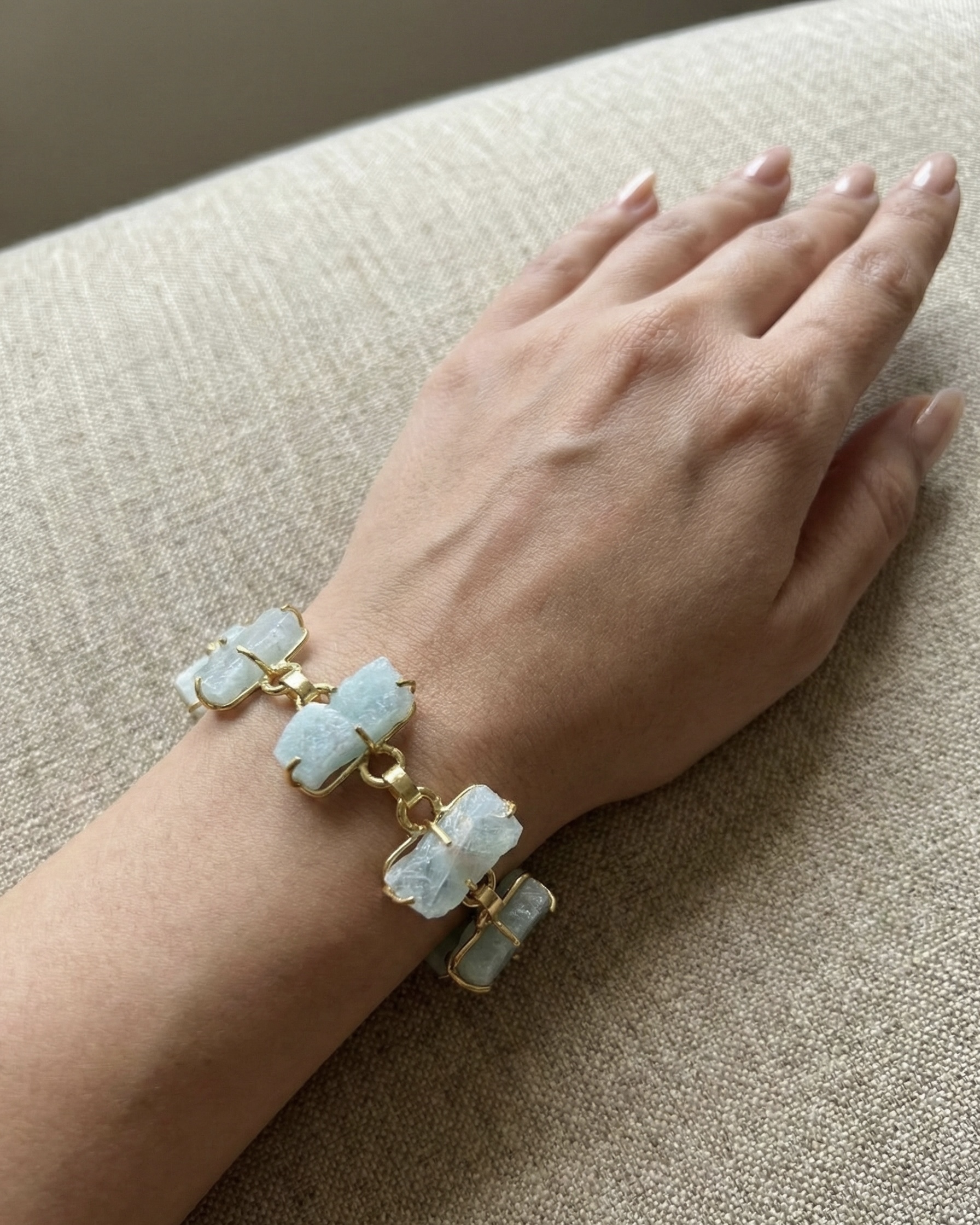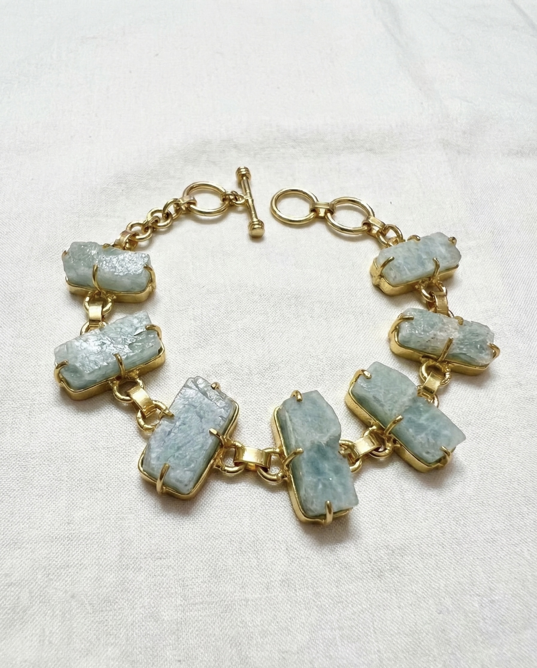 Raw aqua-toned stones set in gold-plated links, offering an earthy, organic charm with a refined contemporary finish.