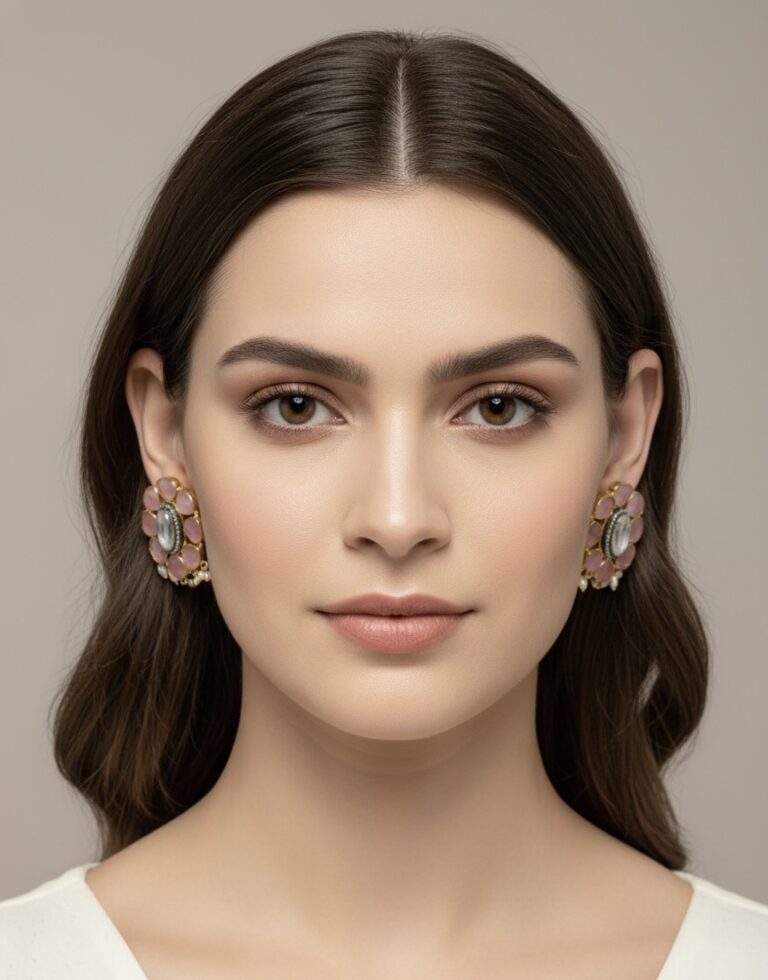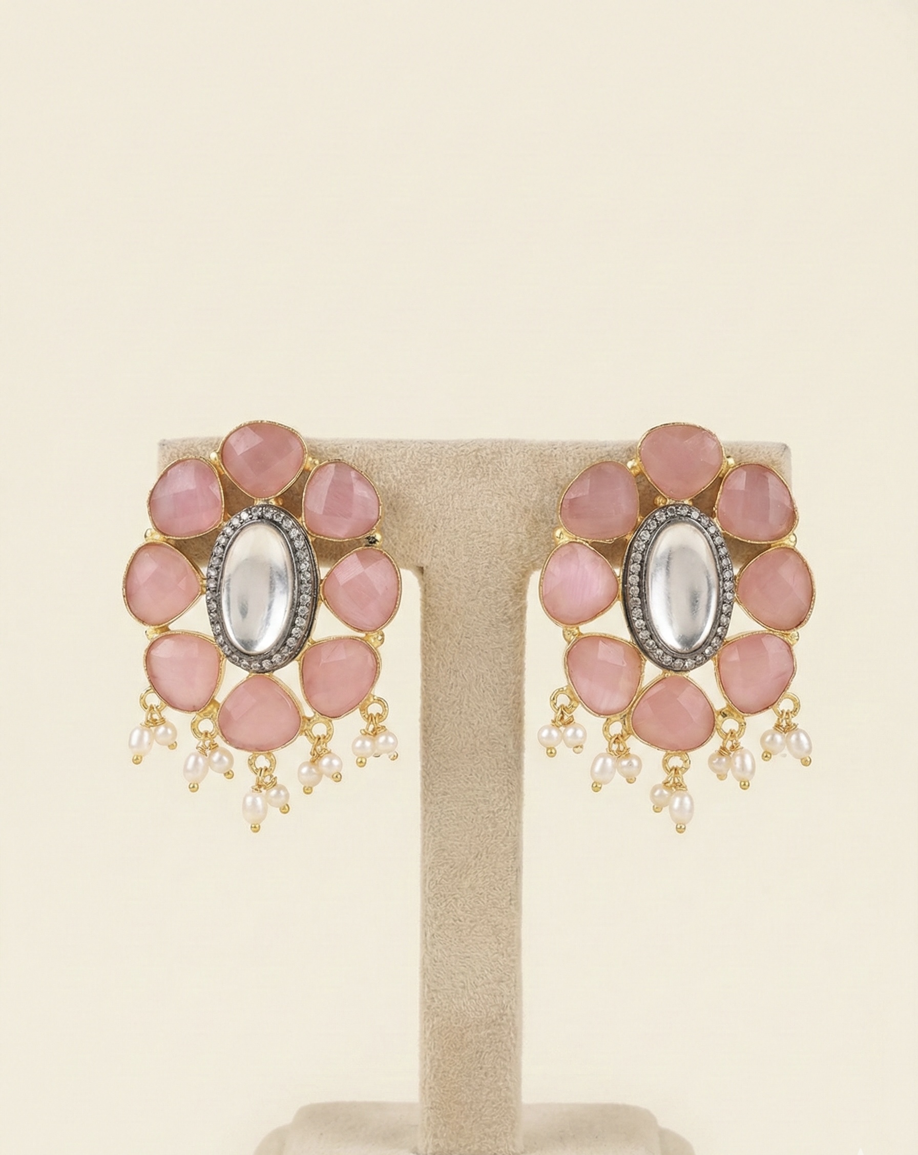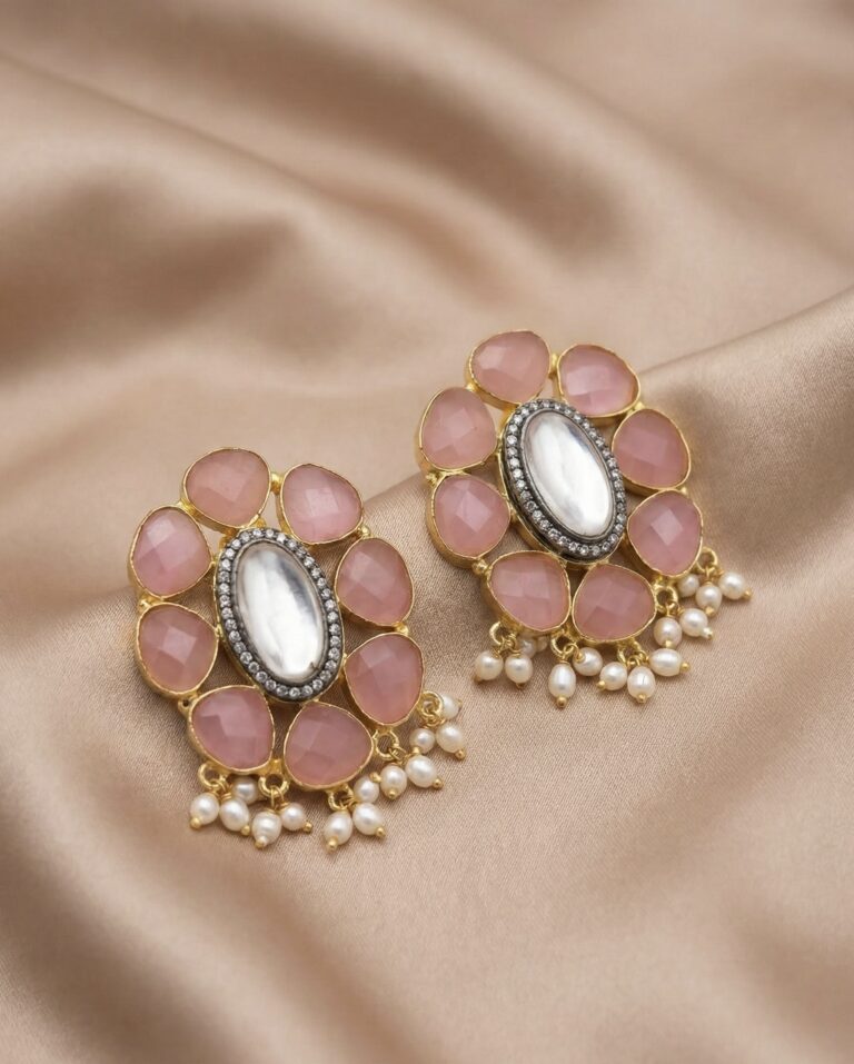 Gold-plated brass statement studs adorned with semi-precious blush stones, central cabochon detail, and pearl hangings. Anti-tarnish coated for elegant festive wear.