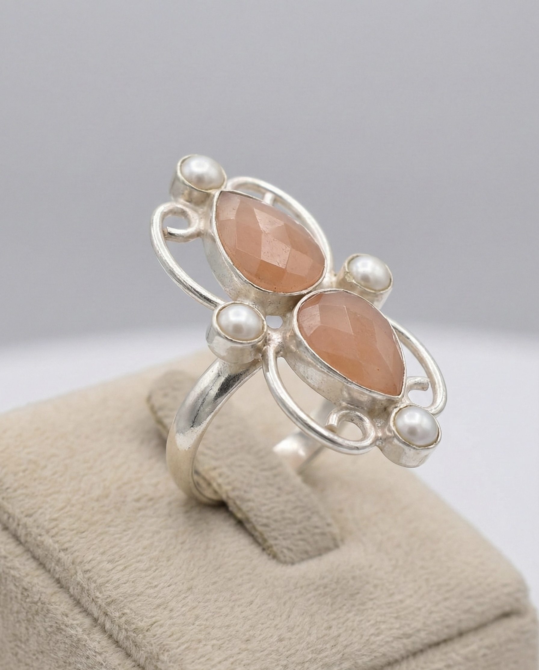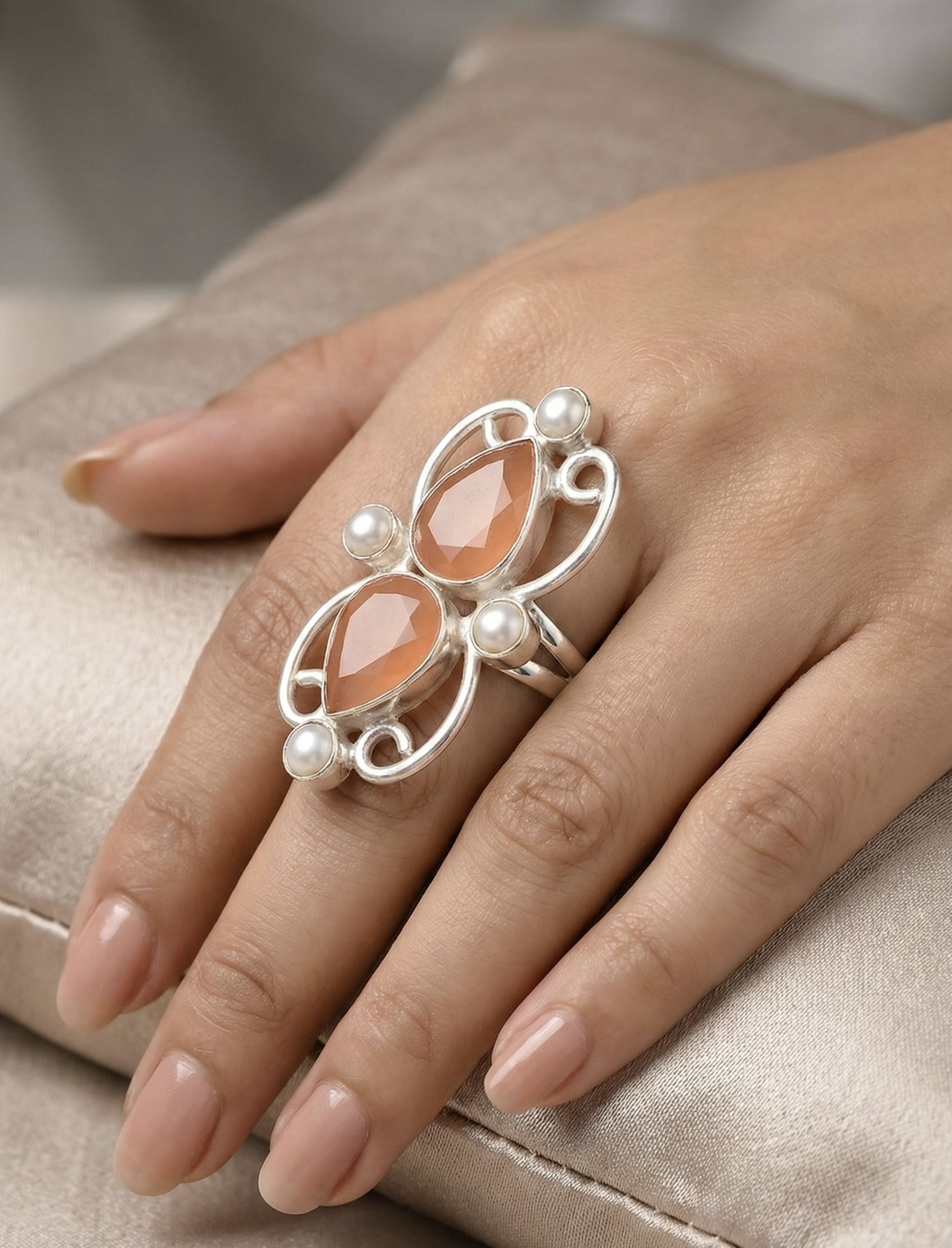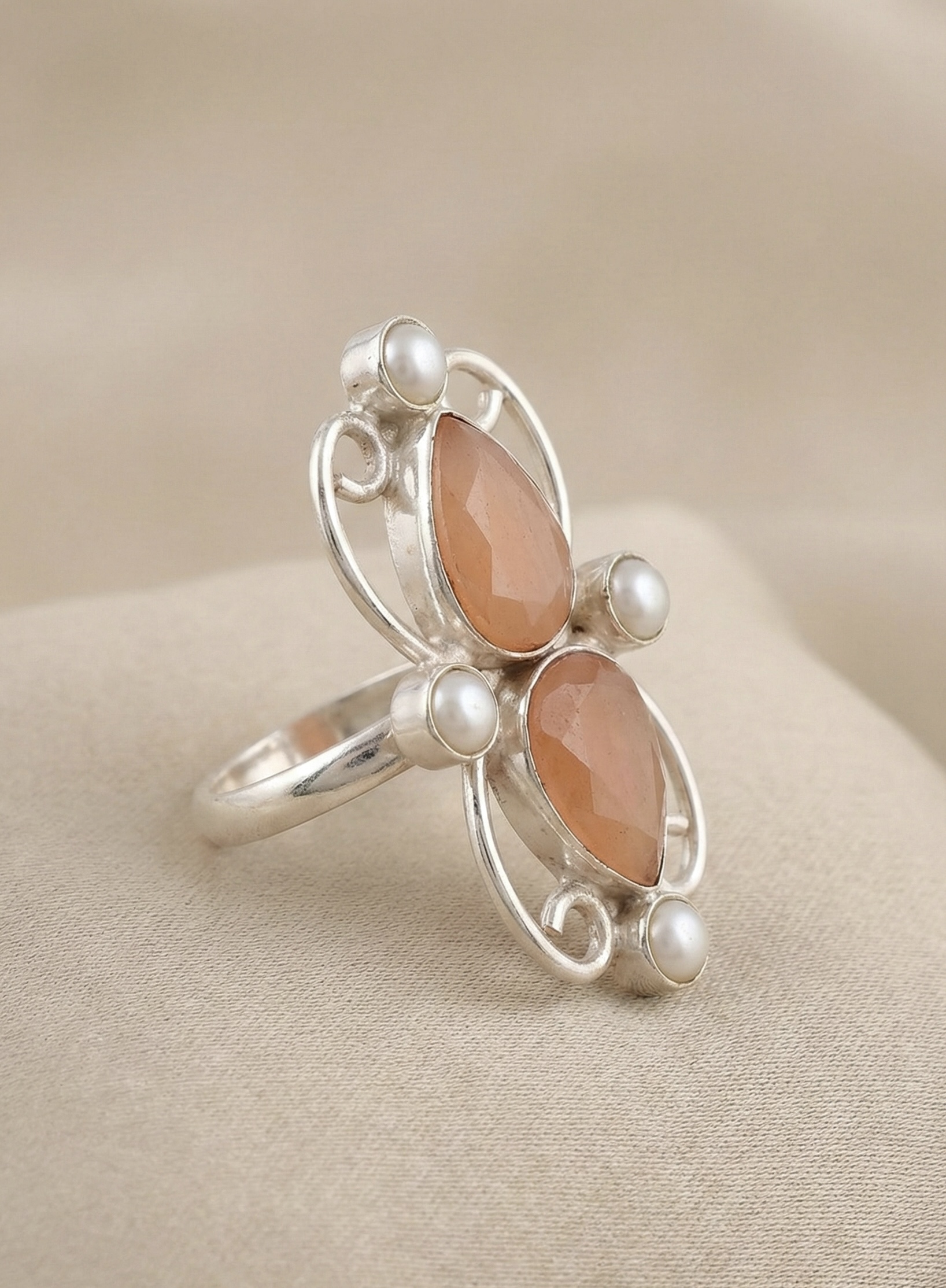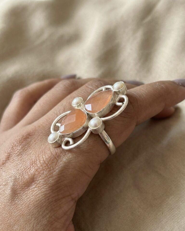 Handcrafted in brass with silver-tone anti-tarnish finish, this elegant ring showcases twin semi-precious peach stones accented with pearls for soft, feminine sophistication.