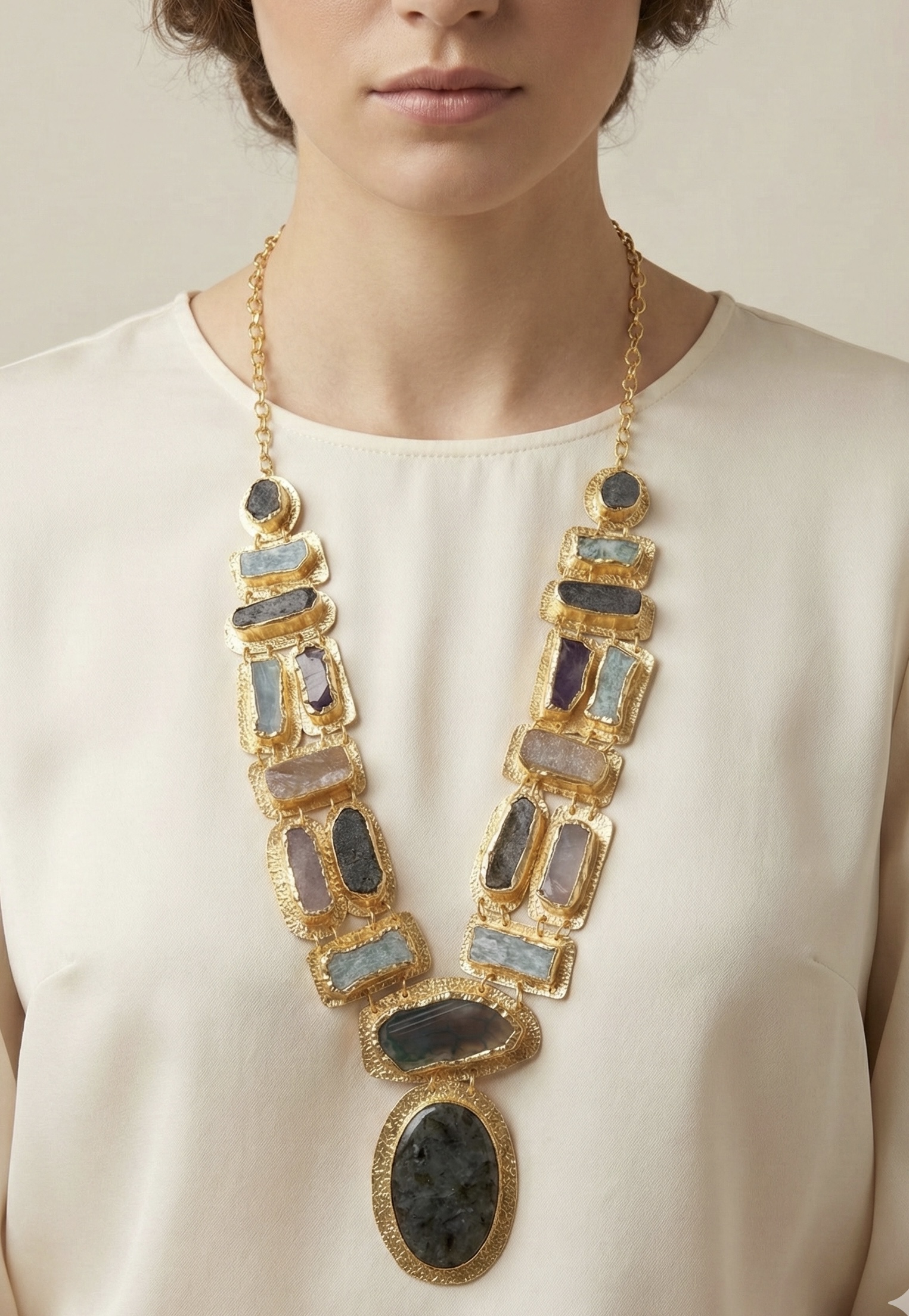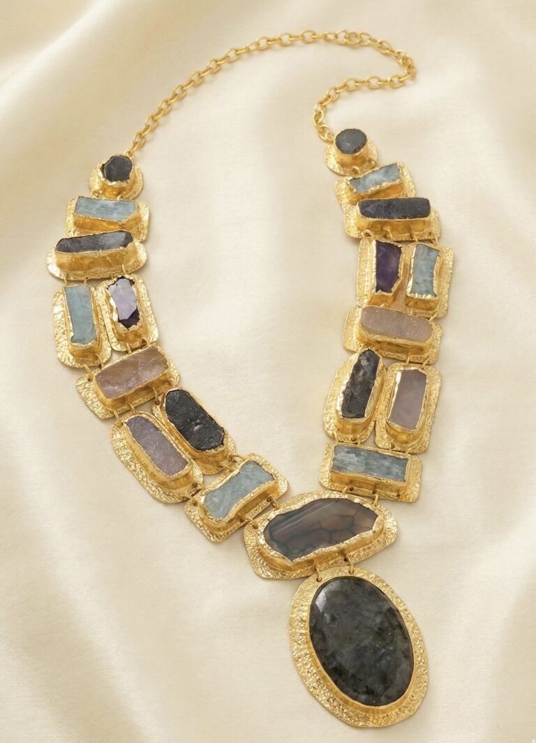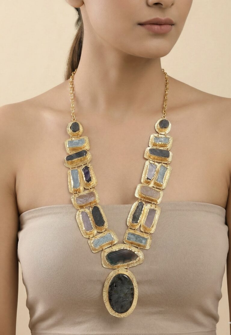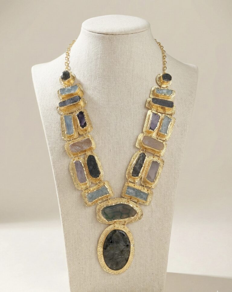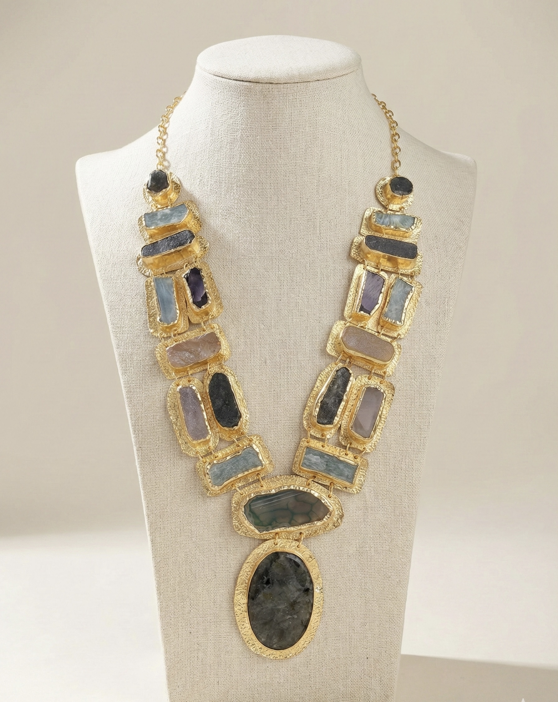Bold gold-plated brass necklace featuring an artistic arrangement of raw semi-precious stones, finished with anti-tarnish coating for contemporary luxury appeal.
