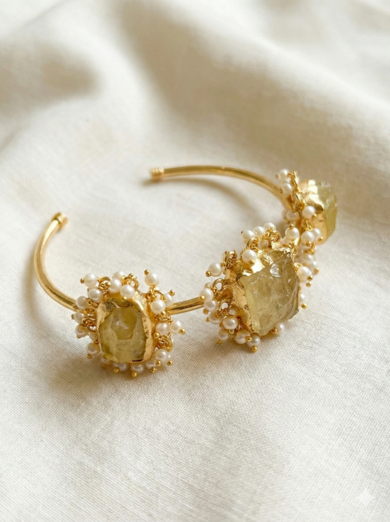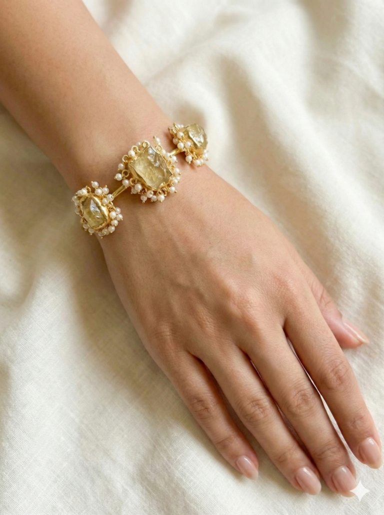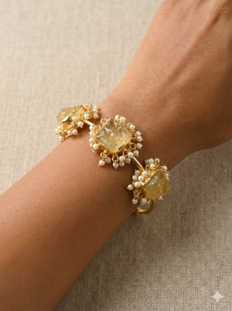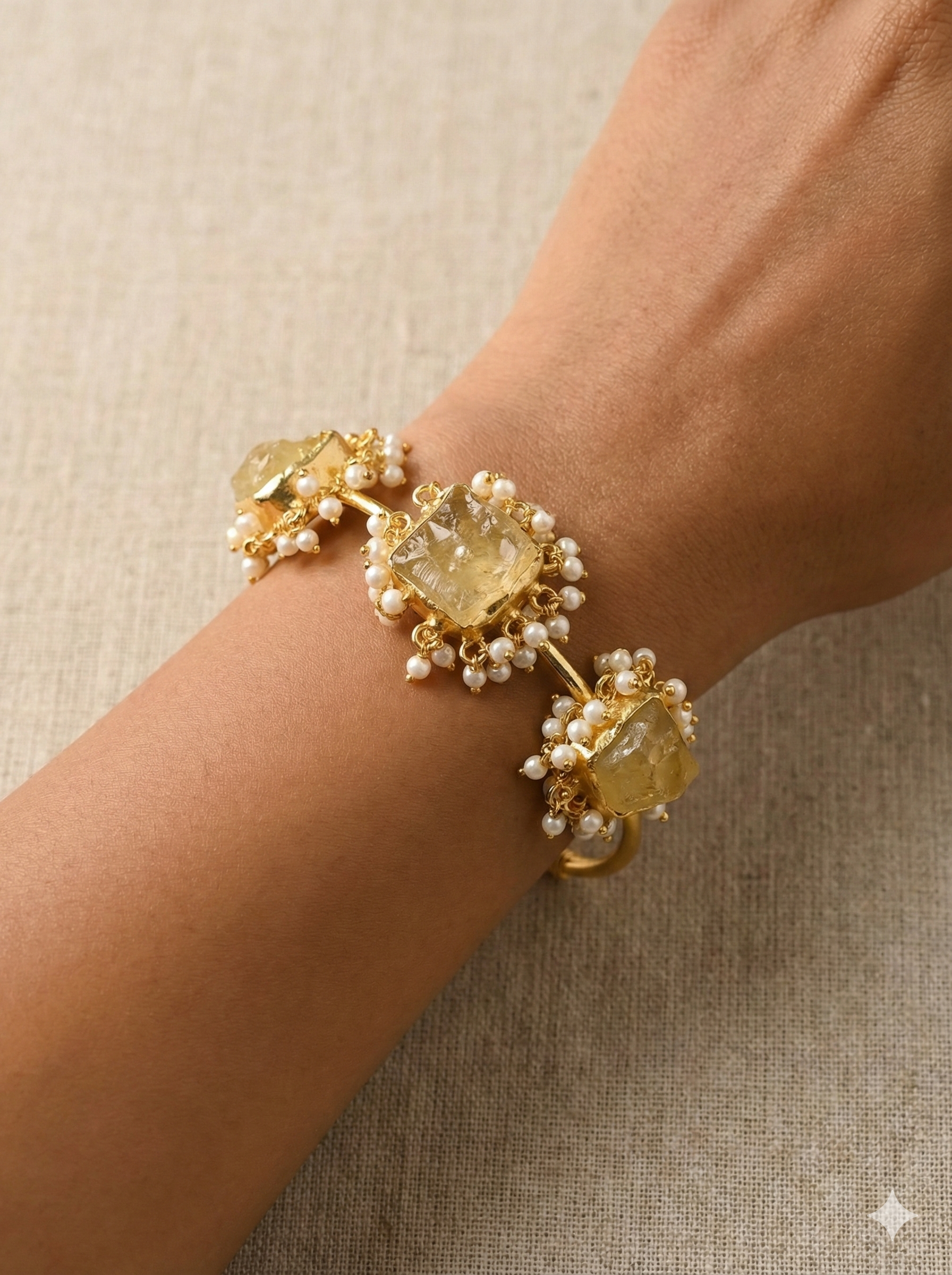 Gold-plated bracelet featuring raw citrine stones and delicate pearl detailing. Ideal for festive occasions, wedding functions, and ethnic styling.