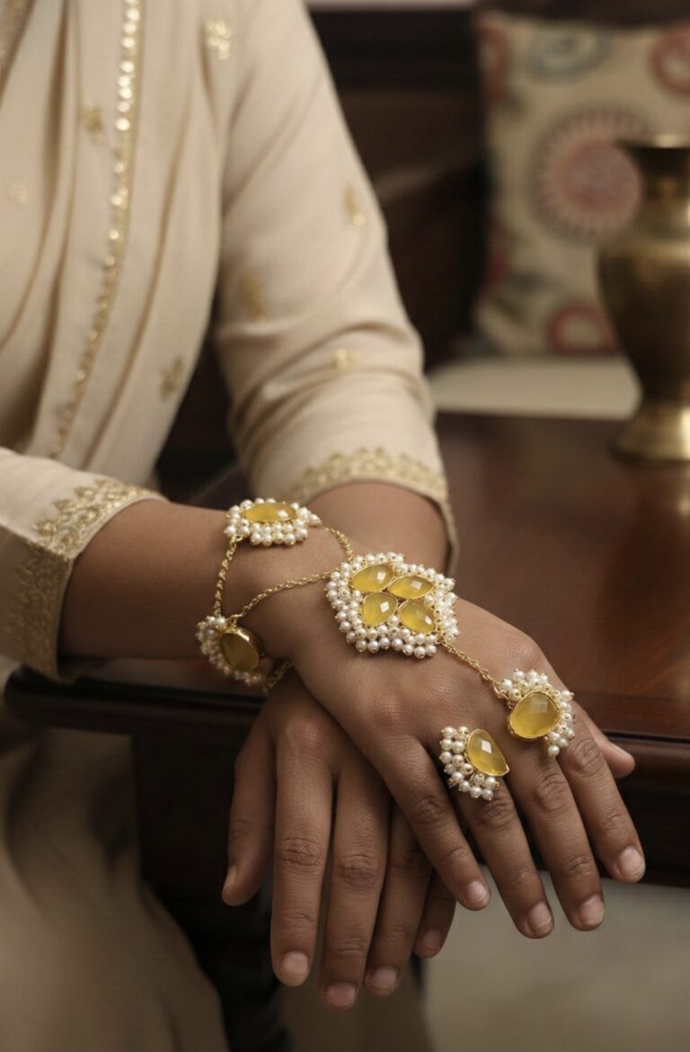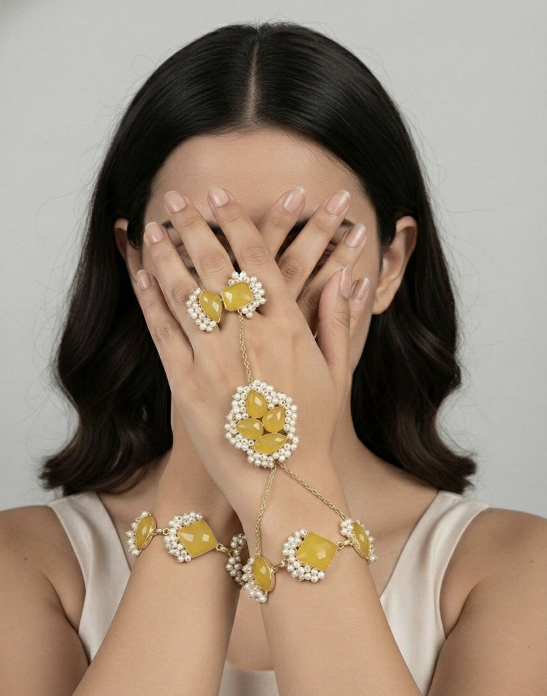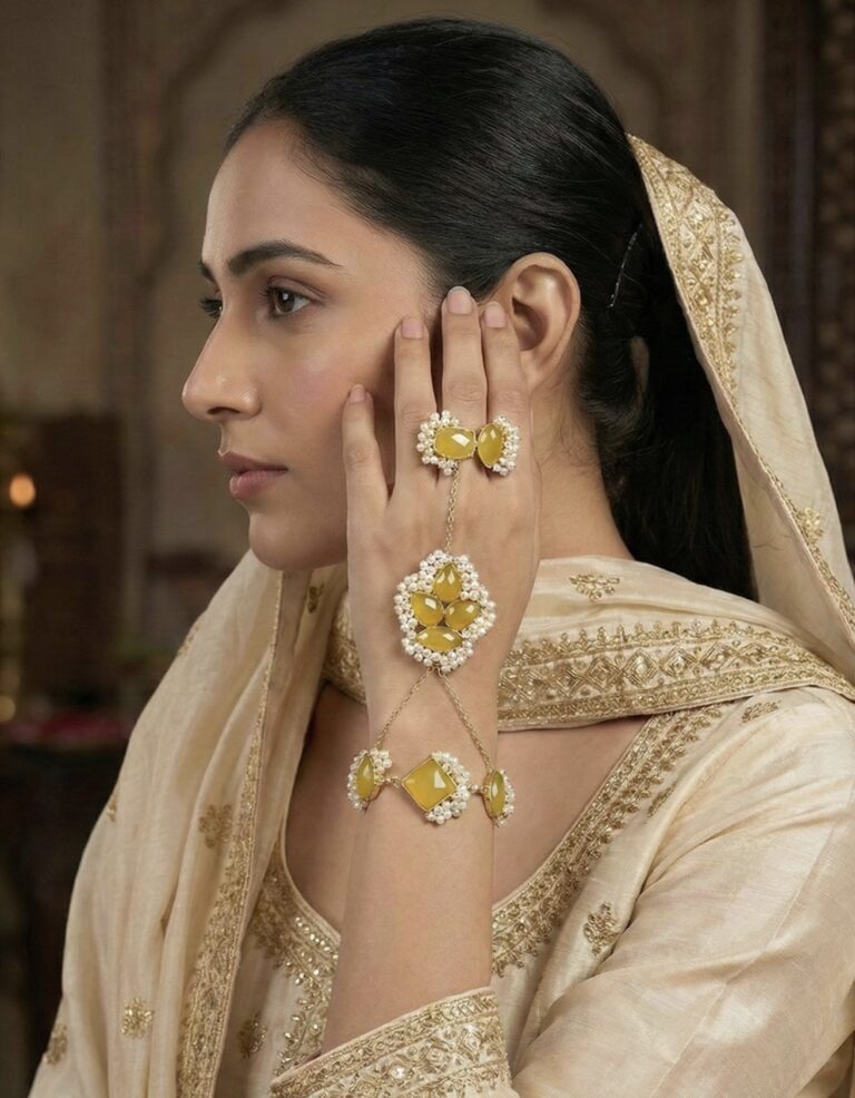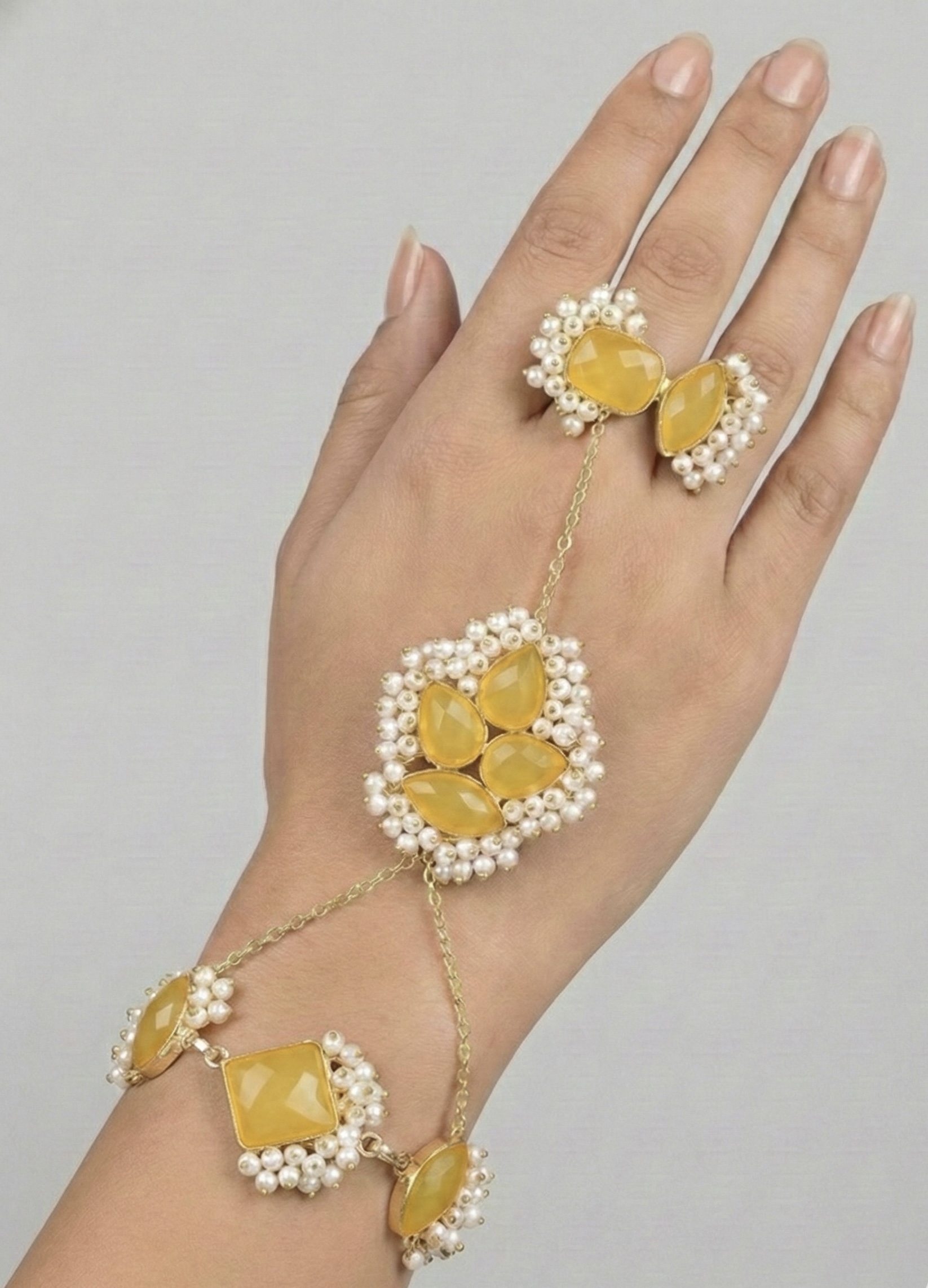 Golden-yellow stones framed with pearls and fine chains form a vibrant handpiece, perfect for bridal, mehendi, and celebration styling.