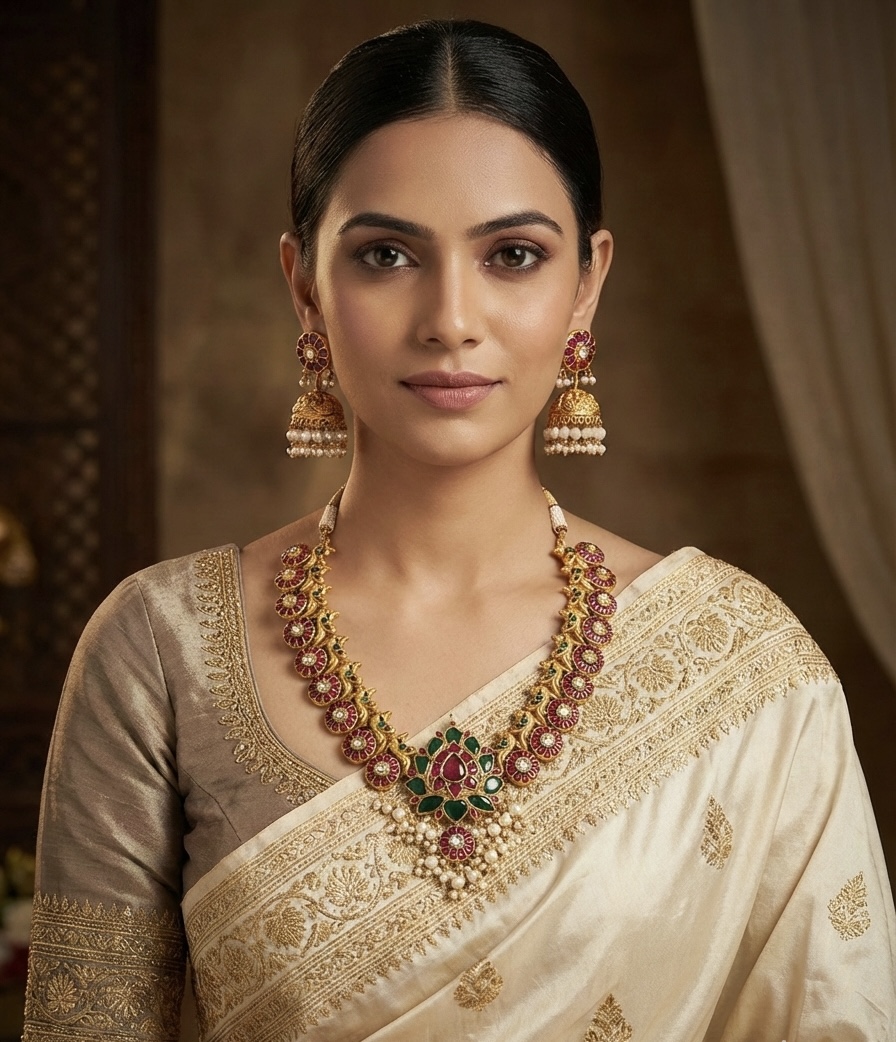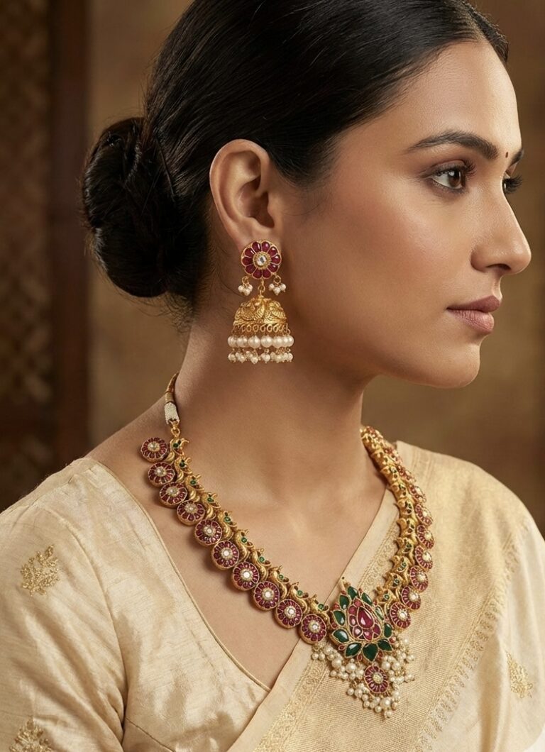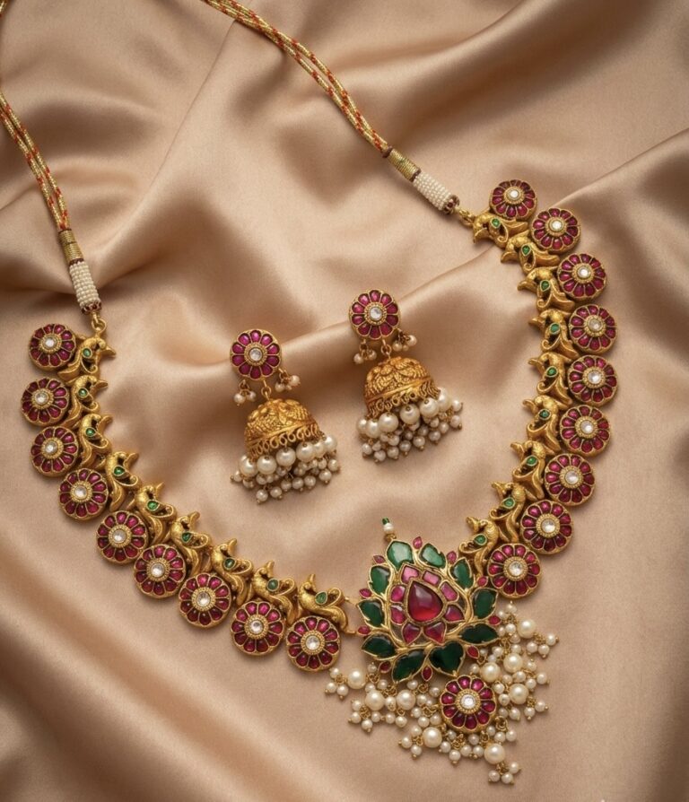 Inspired by the delicate inlay artistry of Mughal palaces, this finely detailed ensemble features harmonious stone placement and graceful motifs, brought to life through exceptional hand craftsmanship.