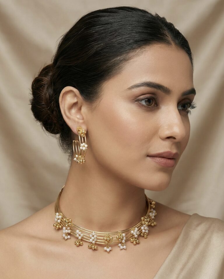 Gold-plated brass choker with delicate pearl clusters and matching earrings, finished with anti-tarnish coating for timeless festive and wedding elegance.
