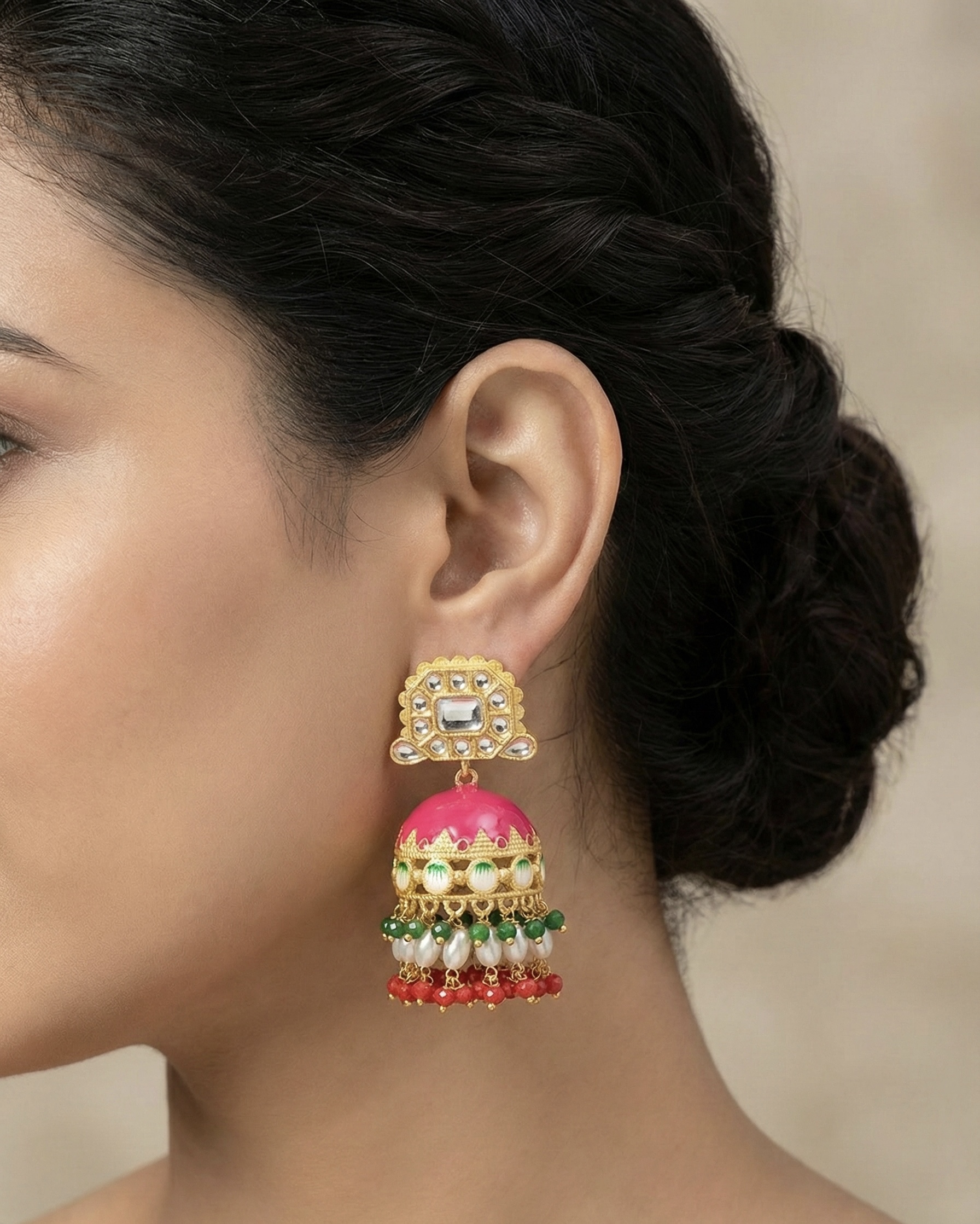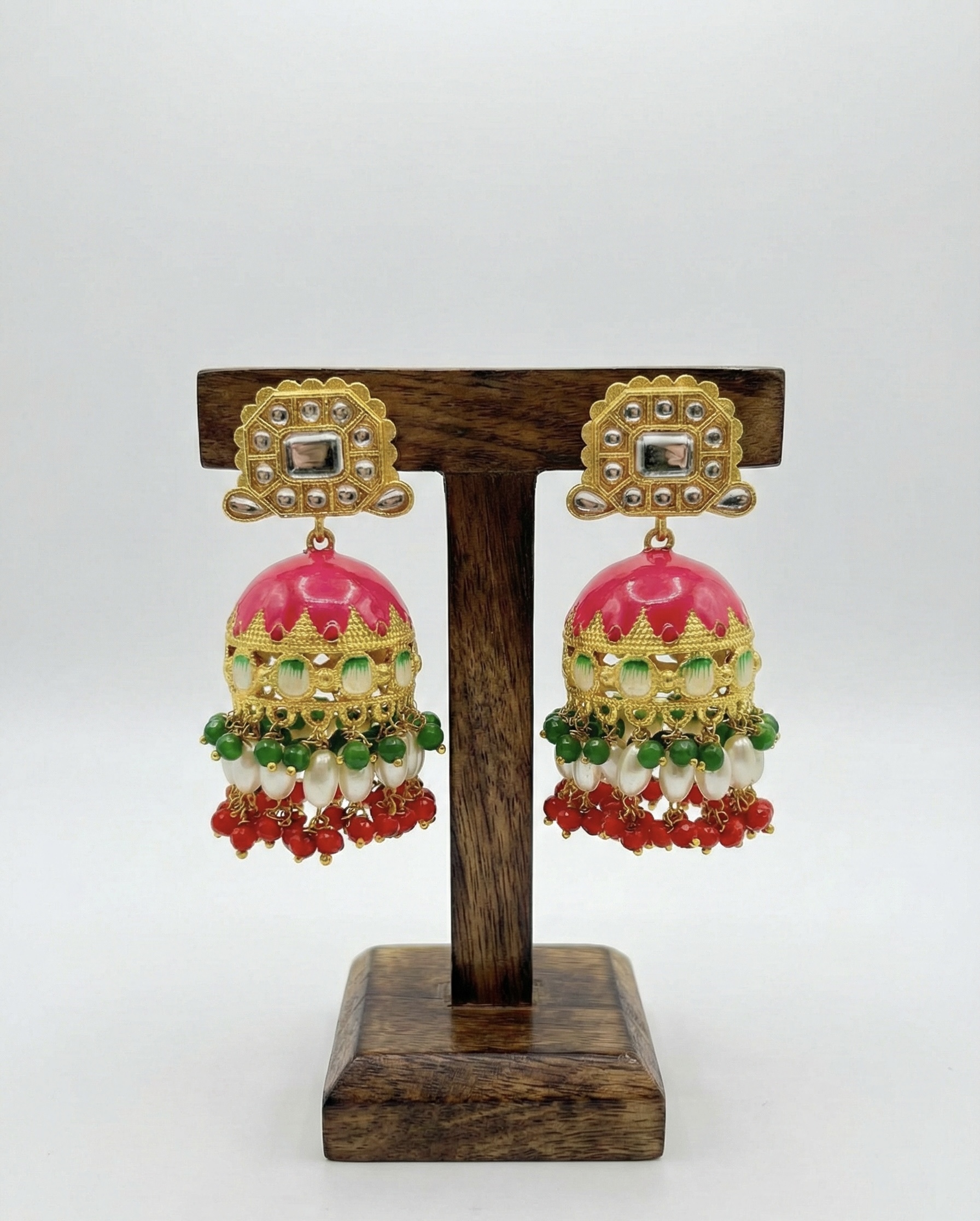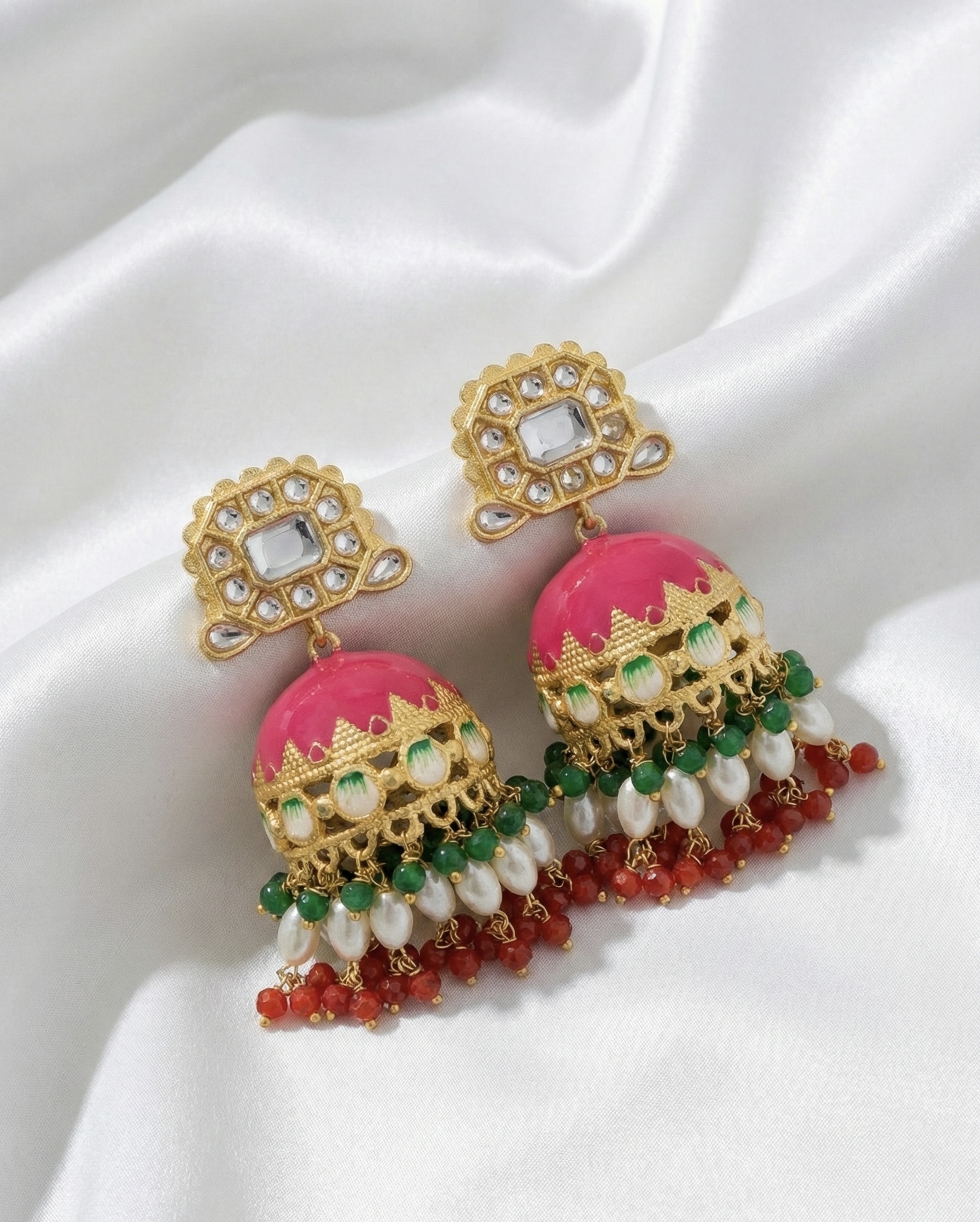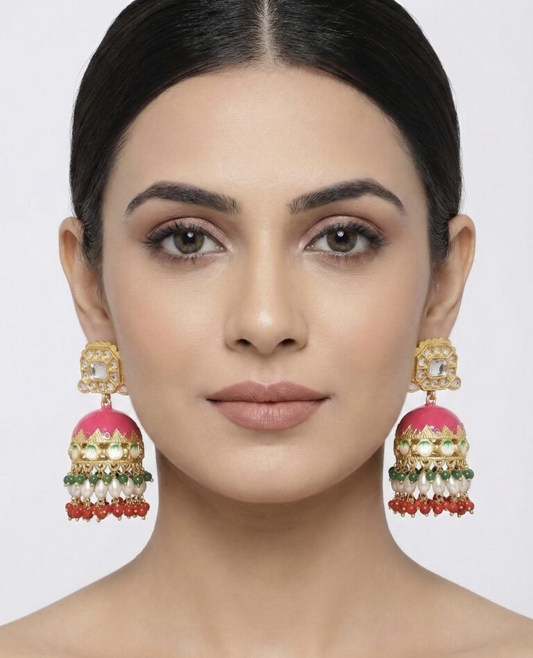 Traditional gold-plated brass jhumkas with enamel detailing, pearl drops, and vibrant bead accents. Anti-tarnish finish makes them perfect for weddings and festive occasions.