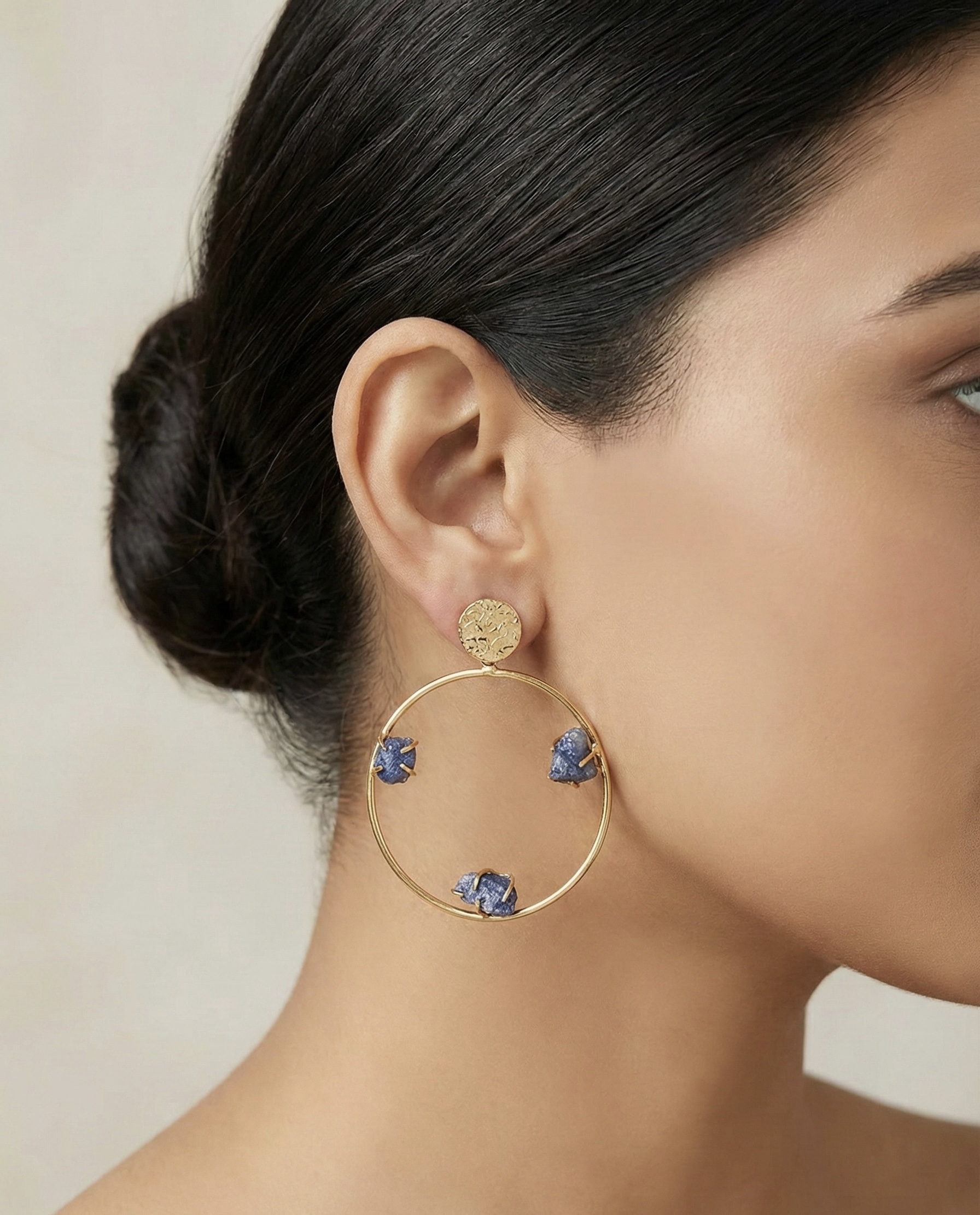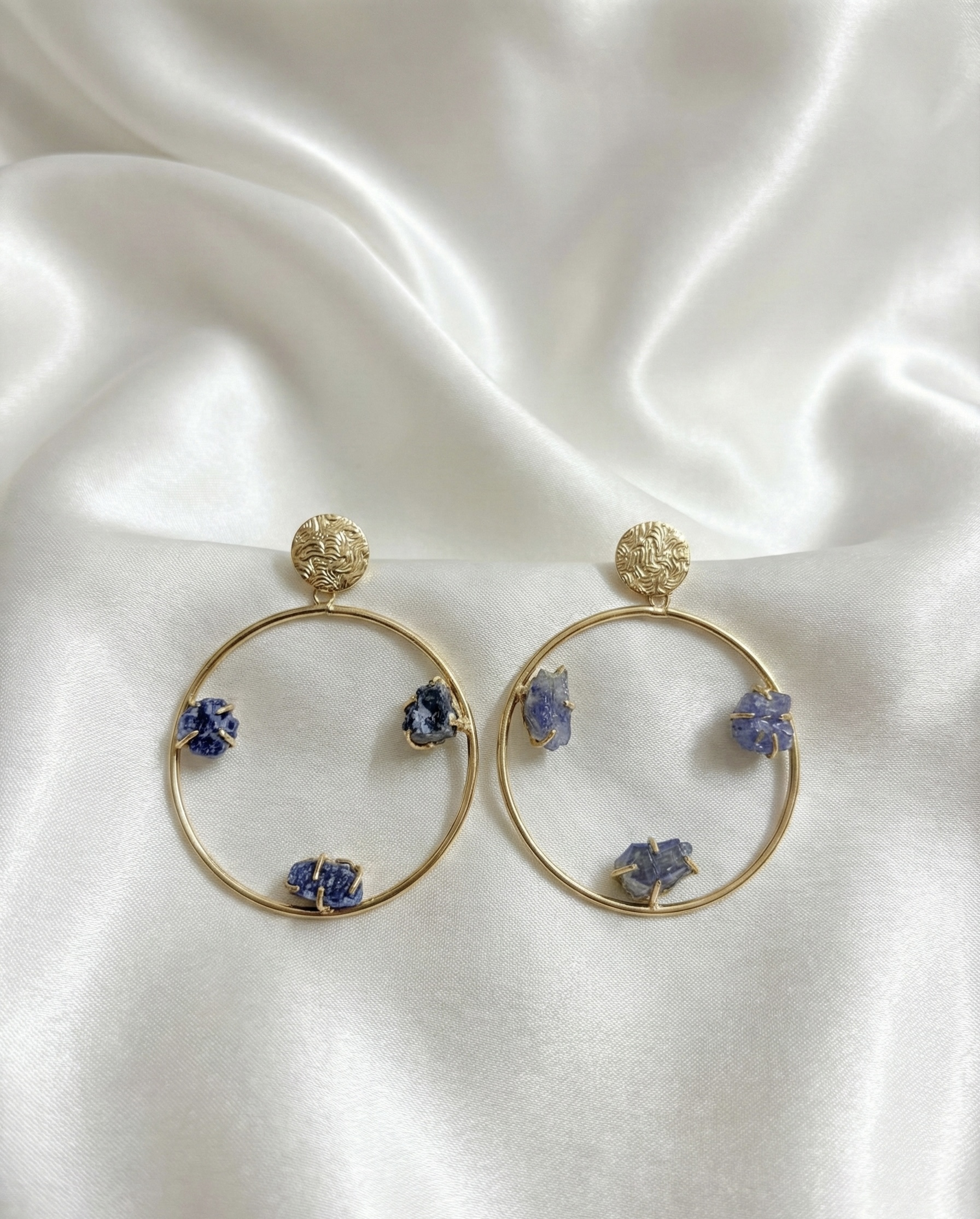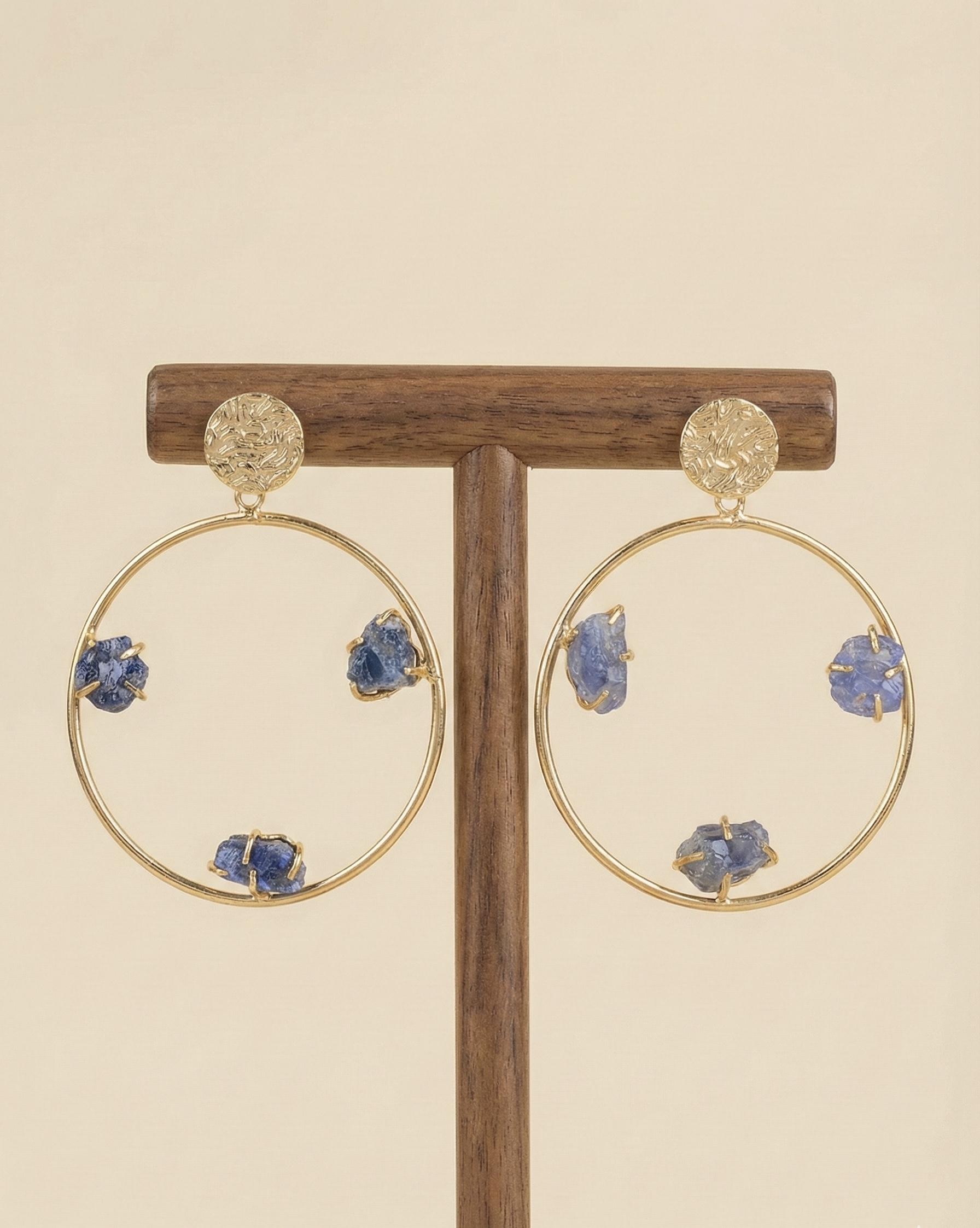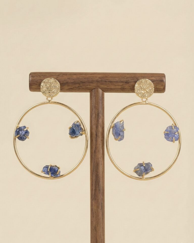 Minimal gold-plated brass hoops adorned with raw semi-precious sapphire stones. Anti-tarnish coating ensures durability with a modern artistic appeal.