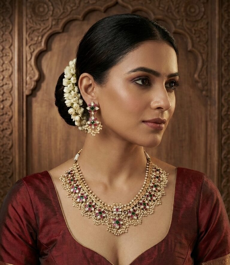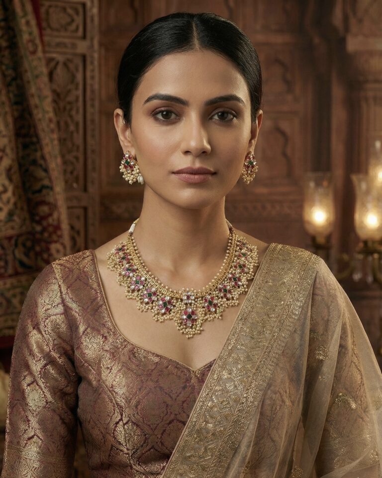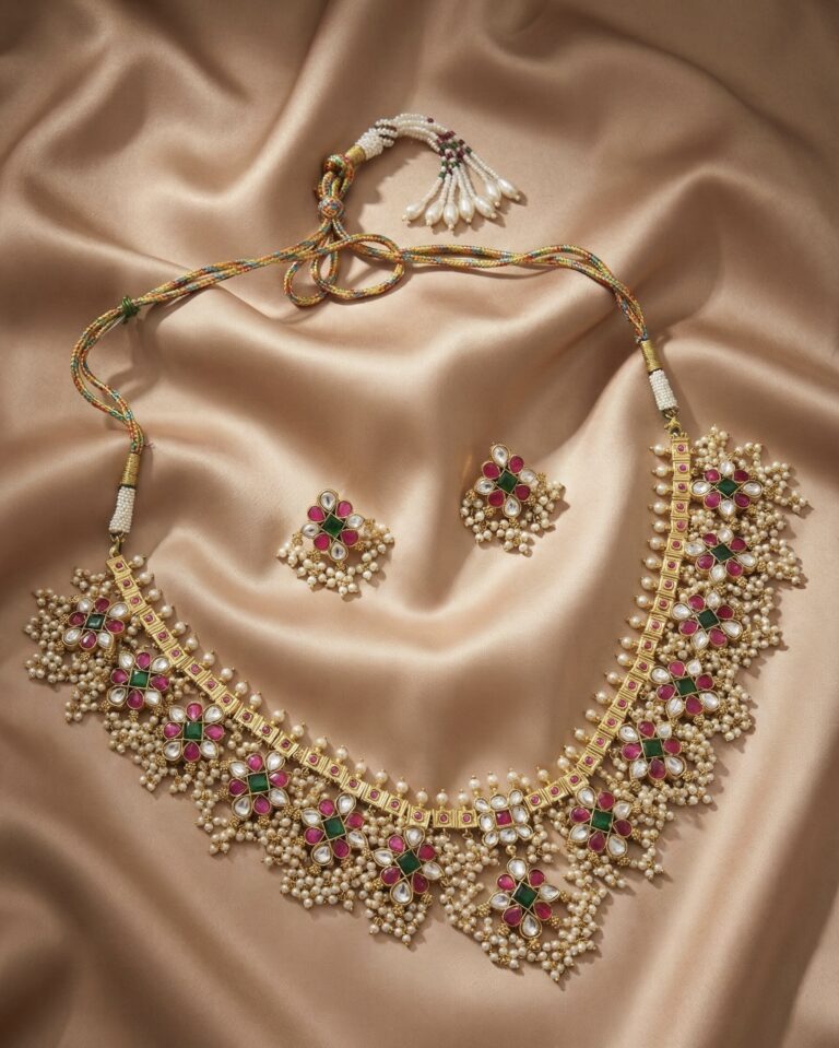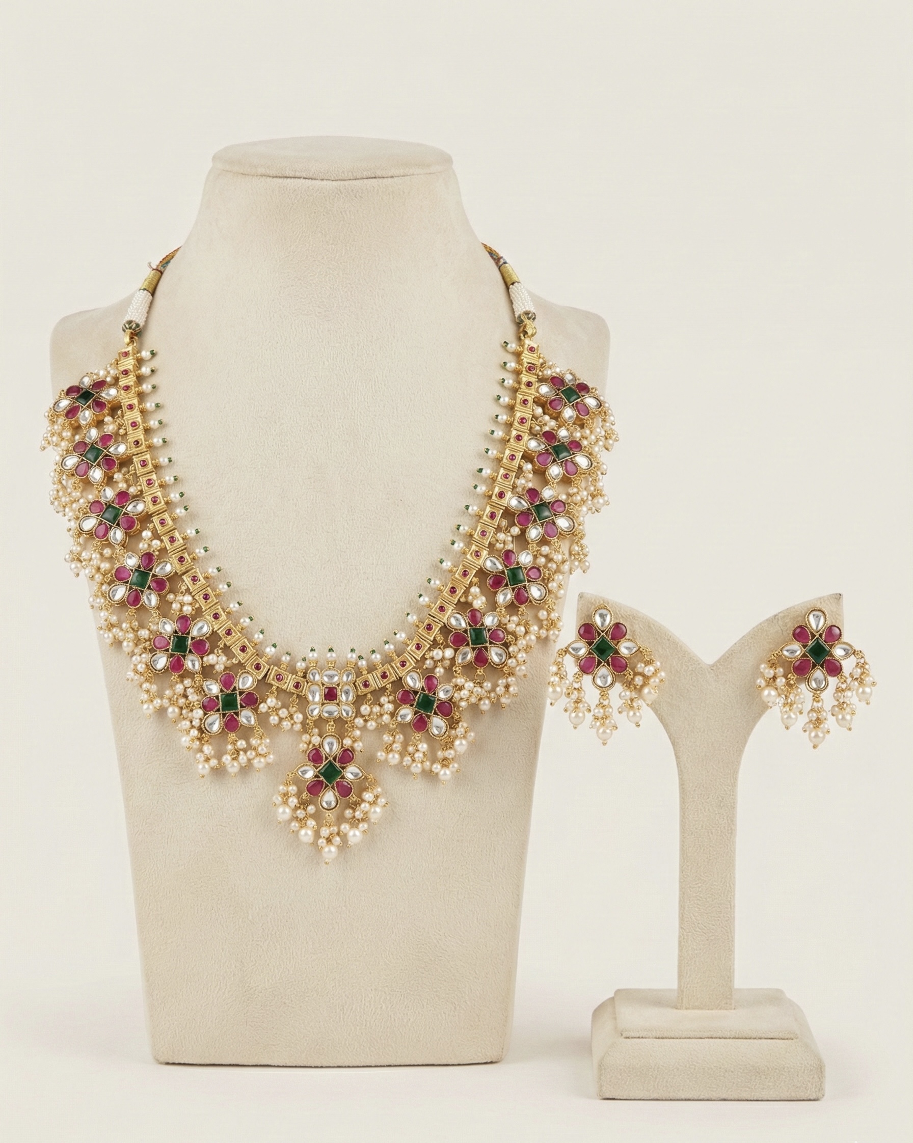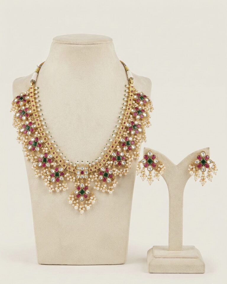A tribute to the opulent gardens of the Mughal courts, this intricately handcrafted jadau set features richly toned semi-precious stones arranged in refined floral symmetry. Grand yet graceful, it embodies imperial elegance and masterful craftsmanship worthy of a royal mehfil.