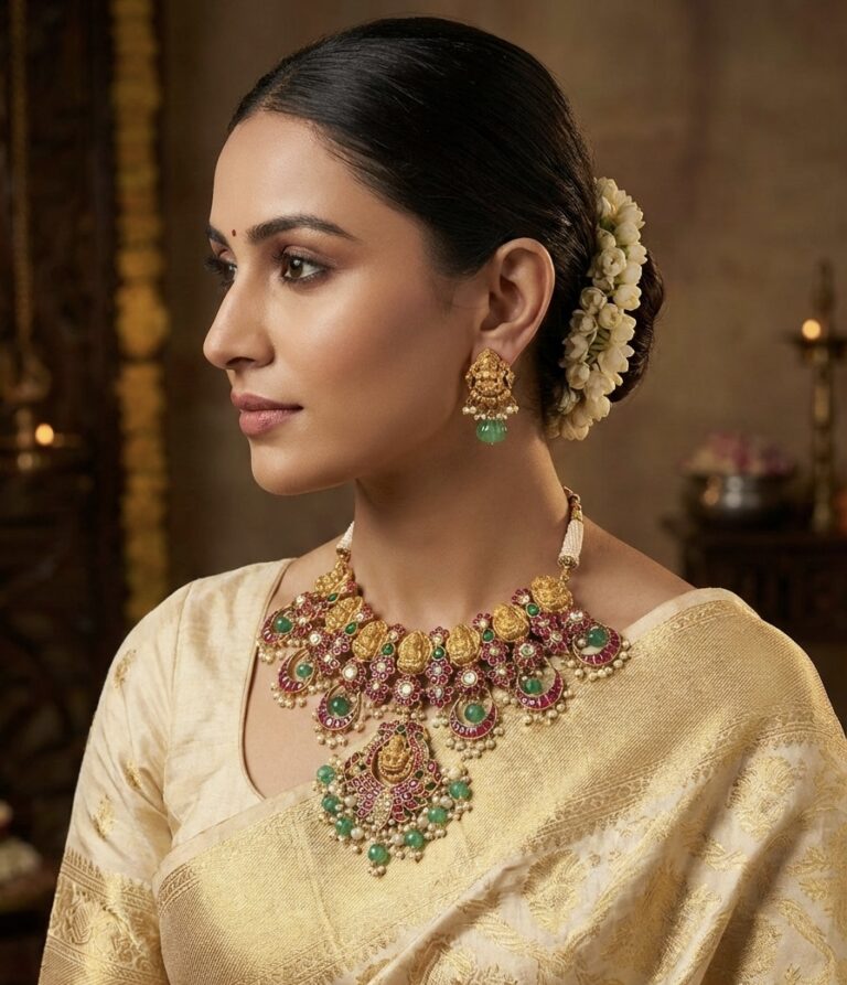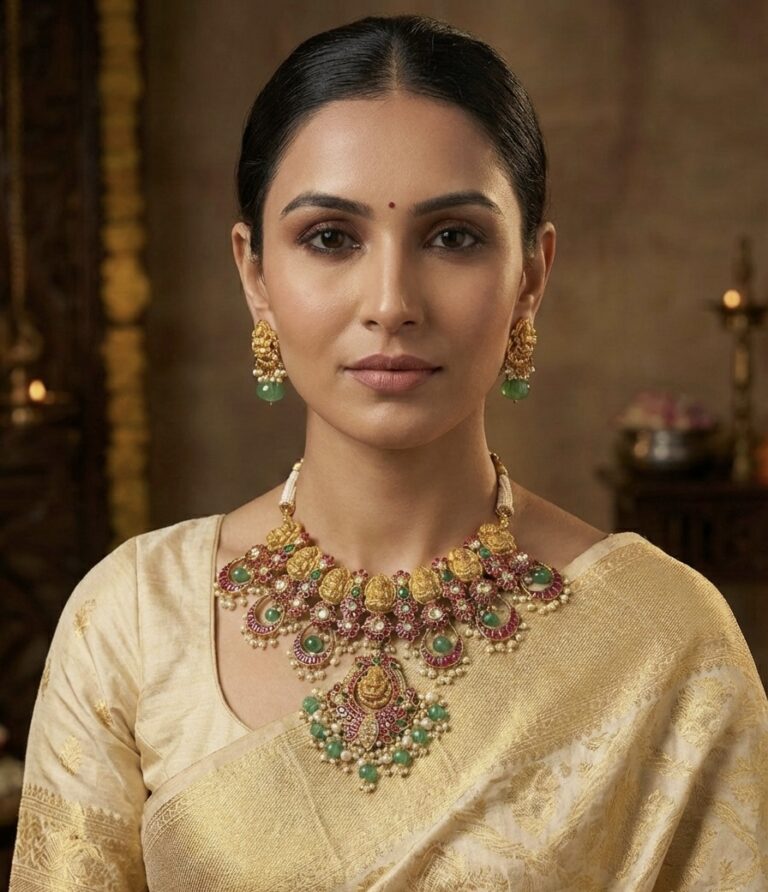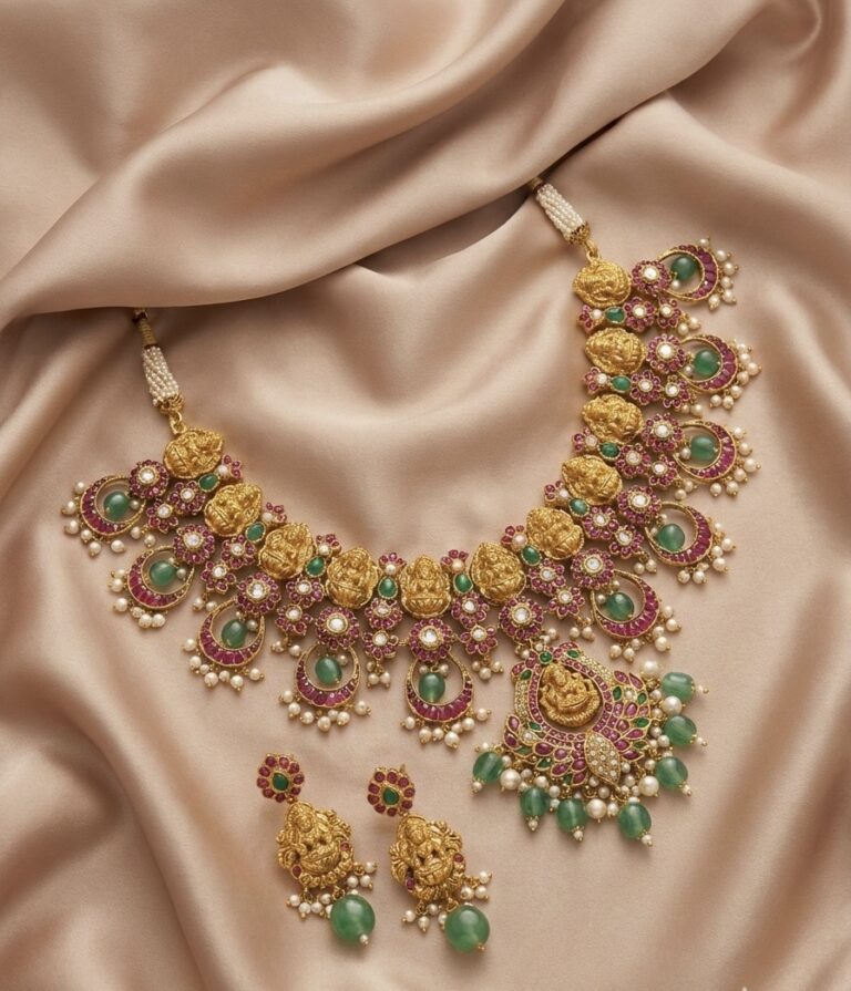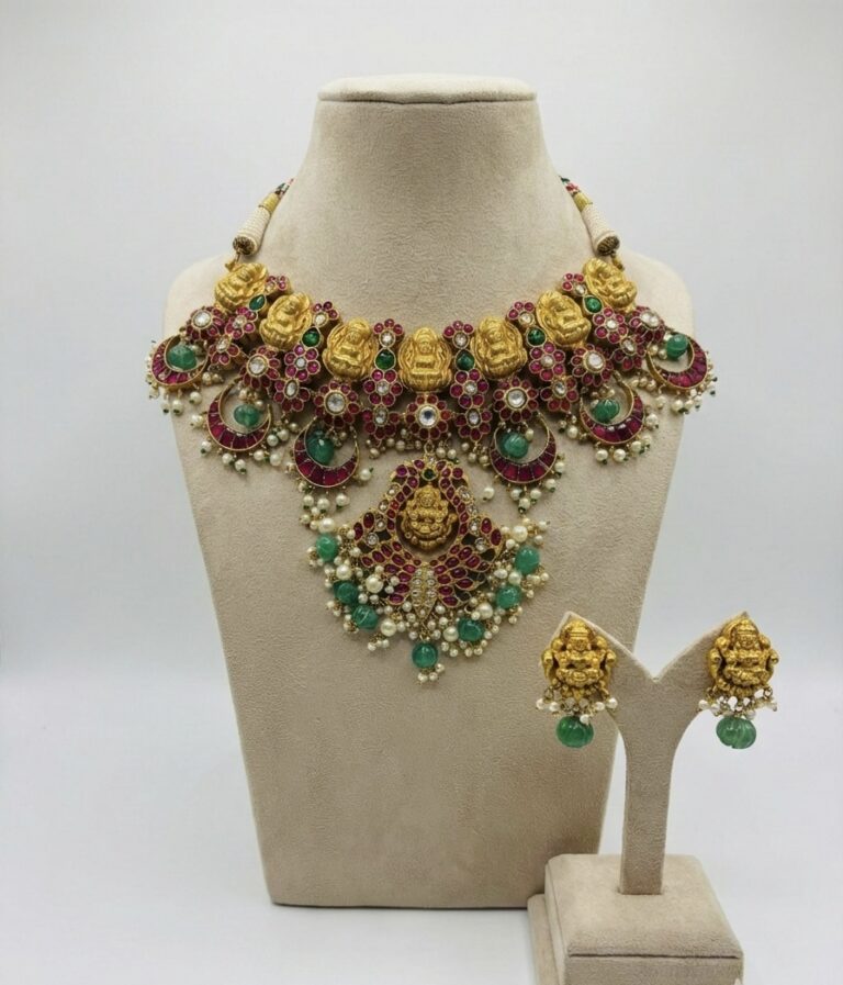 An architectural masterpiece inspired by Mughal arches and symmetry. Intricately arranged semi-precious stones and meticulous hand craftsmanship create a statement of authority, refinement and regal composure.